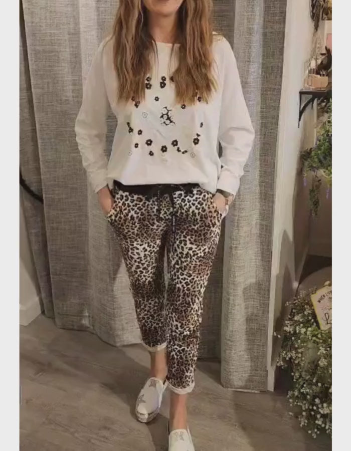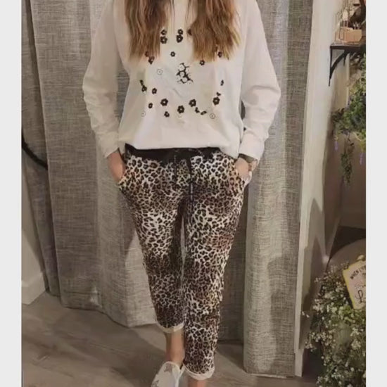 Cleo Leopard Print Track Pants. Made from breathable cotton, these pants give you all-day comfort while making sure your style is anything but ordinary. The relaxed fit and easy pull-on design make them perfect for lounging, running errands, or pairing with a crisp tee and sneakers for an off-duty chic look.