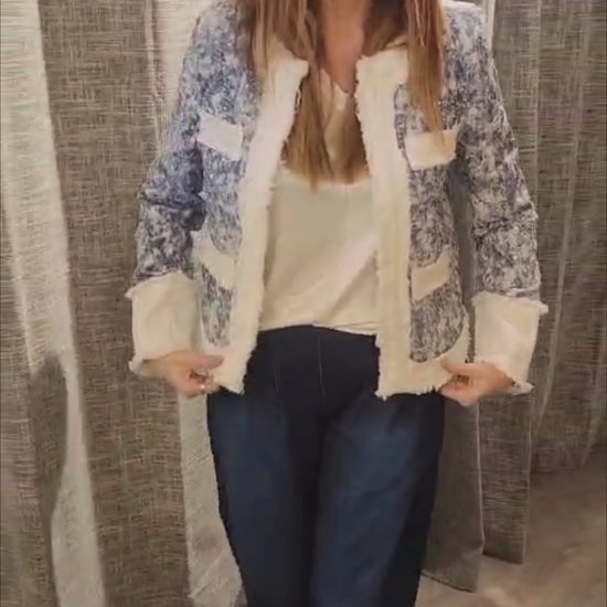 Denim & White Mottled Pattern Sparkly Fringed Jacket