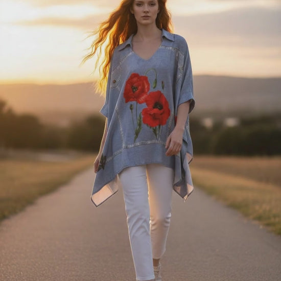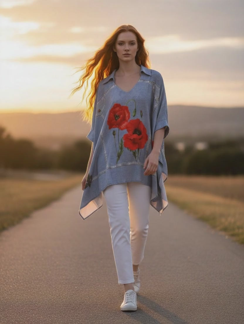 This standout piece combines the relaxed comfort of a poncho with the timeless appeal of denim. The soft fabric drapes elegantly, creating a flattering silhouette that moves with you, while the sleeves create structure. The red poppies add a vibrant artistic touch, making this poncho a true statement piece for any wardrobe.