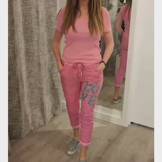 Crafted from a soft, flowing blend of viscose and nylon, these pants are as comfortable as they are striking. The standout embroidered LOVE motif brings personality and positivity, turning a wardrobe staple into a statement piece.
