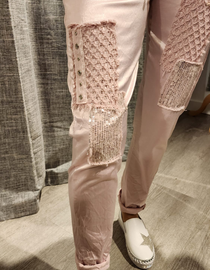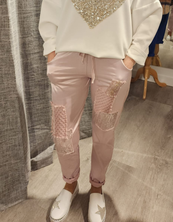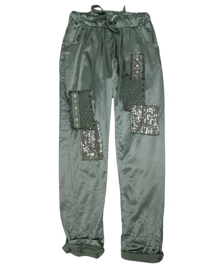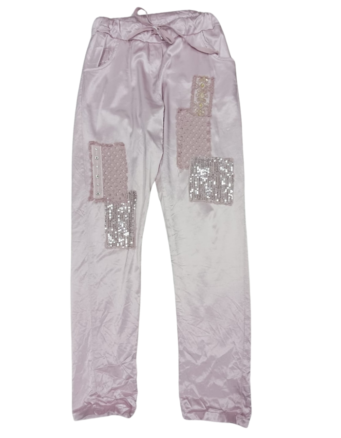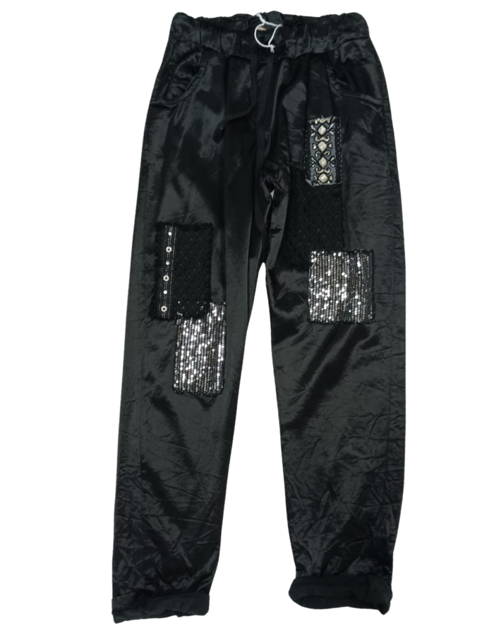 Satin Look Sequin Patch Stretch Pants - $129.00
